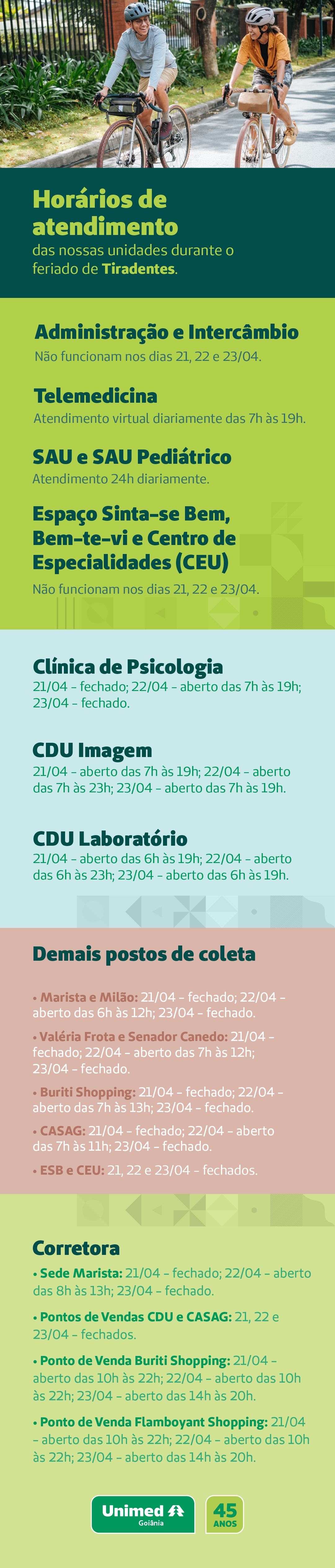 Horários de atendimento das nossas unidades durante o feriado de Tiradentes